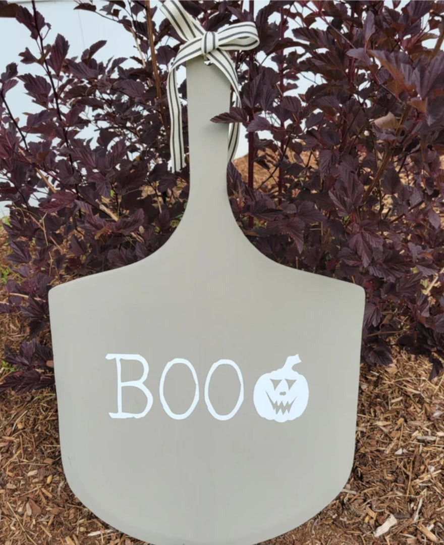 This is a Paddle Wooden Sign with Decal of the wording Boo.